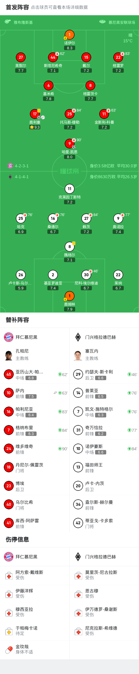在慕尼黑安联球场上演的这场德甲比赛中,拜仁慕尼黑坐镇主场迎战门兴格拉德巴赫。这也是拜仁队长穆勒的告别战,全场氛围异常热烈。奥利塞在上半场第31分钟助攻凯恩破门,为球队取得领先。而下半场,萨内的助攻为奥利塞再破门,锁定胜局。