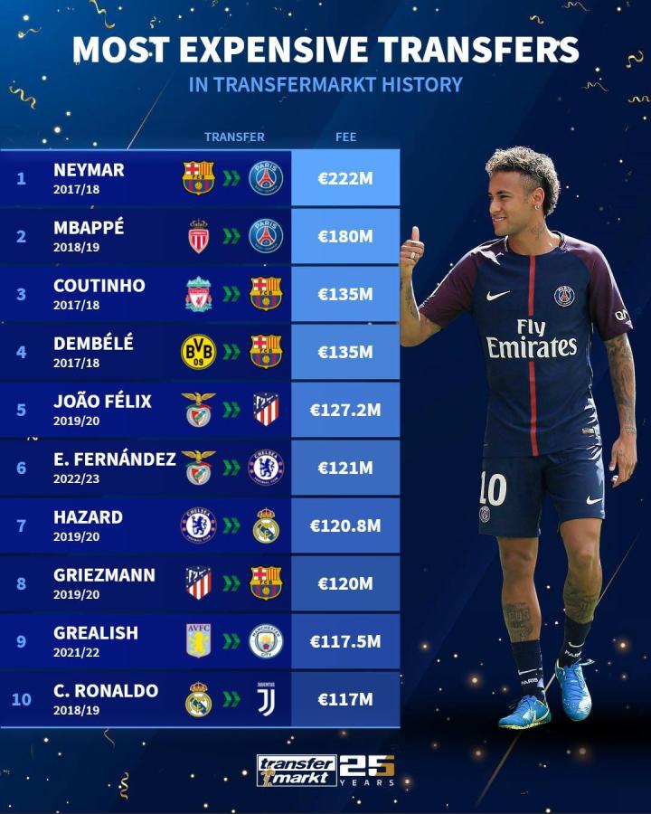 为庆祝德国转会市场成立25周年,在昨天的发布会上,德转市场公布了历史最高转会费纪录前十名球员的排行榜。霸榜多年的内马尔在17/18赛季以2.22亿欧元从巴萨转投巴黎,再次稳坐榜首位置。紧随其后的是2018/19赛季从摩纳哥转会至巴黎的姆巴佩,转会费高达1.8亿欧元,令人瞩目。